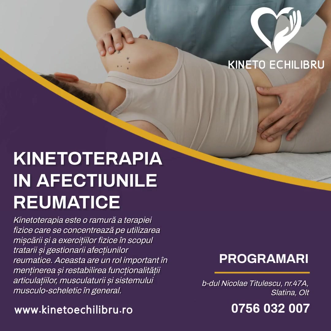 Kinetoterapia în afectiunile reumatice reprezintă o modalitate eficientă de tratament și management al simptomelor asociate cu diverse afecțiuni reumatice, cum ar fi artrita reumatoidă, osteoartrita, spondilita anchilozantă și fibromialgia. Aceasta are ca scop îmbunătățirea mobilității articulare, reducerea durerii și inflamației, creșterea forței musculare și îmbunătățirea calității vieții pacienților.