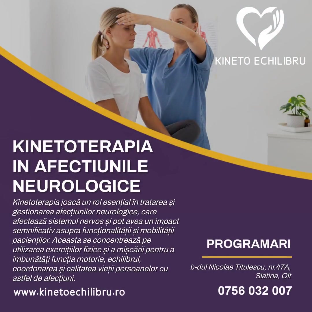 Kinetoterapia în afectiunile neurologice reprezintă o modalitate eficientă de tratament și recuperare pentru pacienții care suferă de afecțiuni ale sistemului nervos, cum ar fi accident vascular cerebral, scleroza multiplă, boala Parkinson, leziuni ale măduvei spinării și alte afecțiuni neurologice.