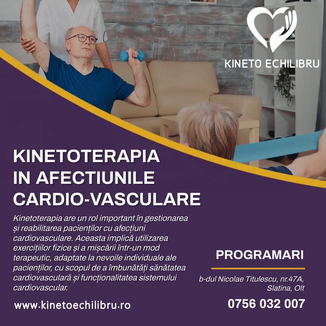 Kinetoterapia în afectiunile cardiovasculare reprezintă o formă de terapie fizică și exercițiu adaptată pentru pacienții care suferă de afecțiuni ale sistemului cardiovascular, cum ar fi boala arterială periferică, hipertensiunea arterială, insuficiența cardiacă și alte afecțiuni cardiovasculare.