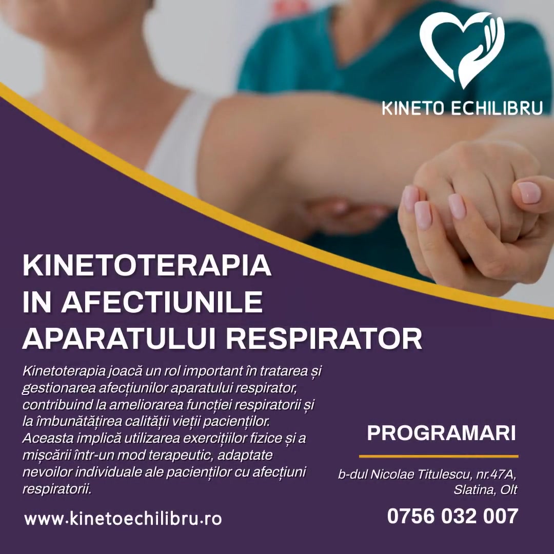 Kinetoterapia în afectiunile aparatului respirator este o ramură a terapiei fizice și a exercițiilor terapeutice care se concentrează pe tratarea și gestionarea afecțiunilor respiratorii, cum ar fi astmul, bronșita cronică, fibroza pulmonară, boala pulmonară obstructivă cronică (BPOC) și alte afecțiuni respiratorii.