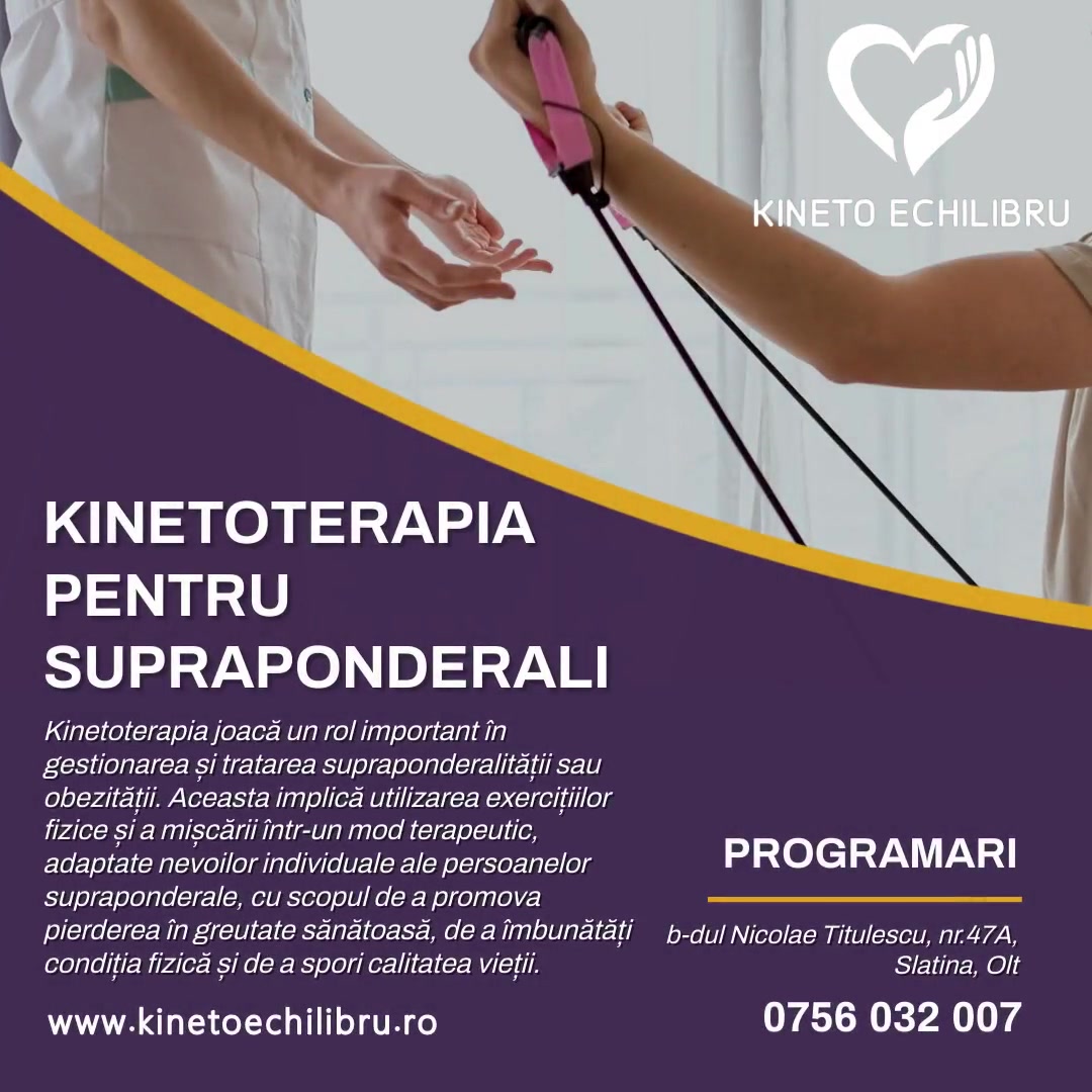 Kinetoterapia pentru persoanele supraponderale este o formă de terapie fizică și exerciții adaptate specific pentru a aborda nevoile și provocările legate de gestionarea greutății corporale într-un mod sănătos. Aceasta implică un program personalizat de exerciții și intervenții terapeutice, adaptate în funcție de starea de sănătate, nivelul de fitness și obiectivele individuale ale pacienților supraponderali.